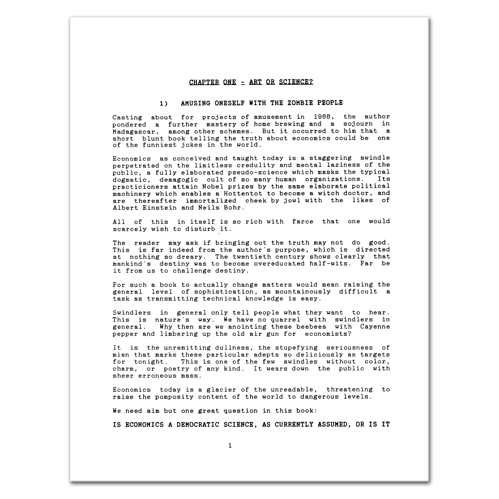 Summary: I am a huge fan of P.Q. Wall’s writing and was delighted when I stumbled across this unpublished manuscript a few years ago. Here’ an excerpt from this books introduction. “Amusing Oneself with the Zombie People: Casting about the projects of amusement in 1988, the author pondered a further mastery of home brewing and a sojourn in Madagascar, among other schemes. But it occurred to him that a short blunt book telling the truth about economics could be one of the funniest jokes in the world.” — This 1988 title is that short blunt masterpiece (IMHO) written by P.Q. Wall in 1988, 29pp.