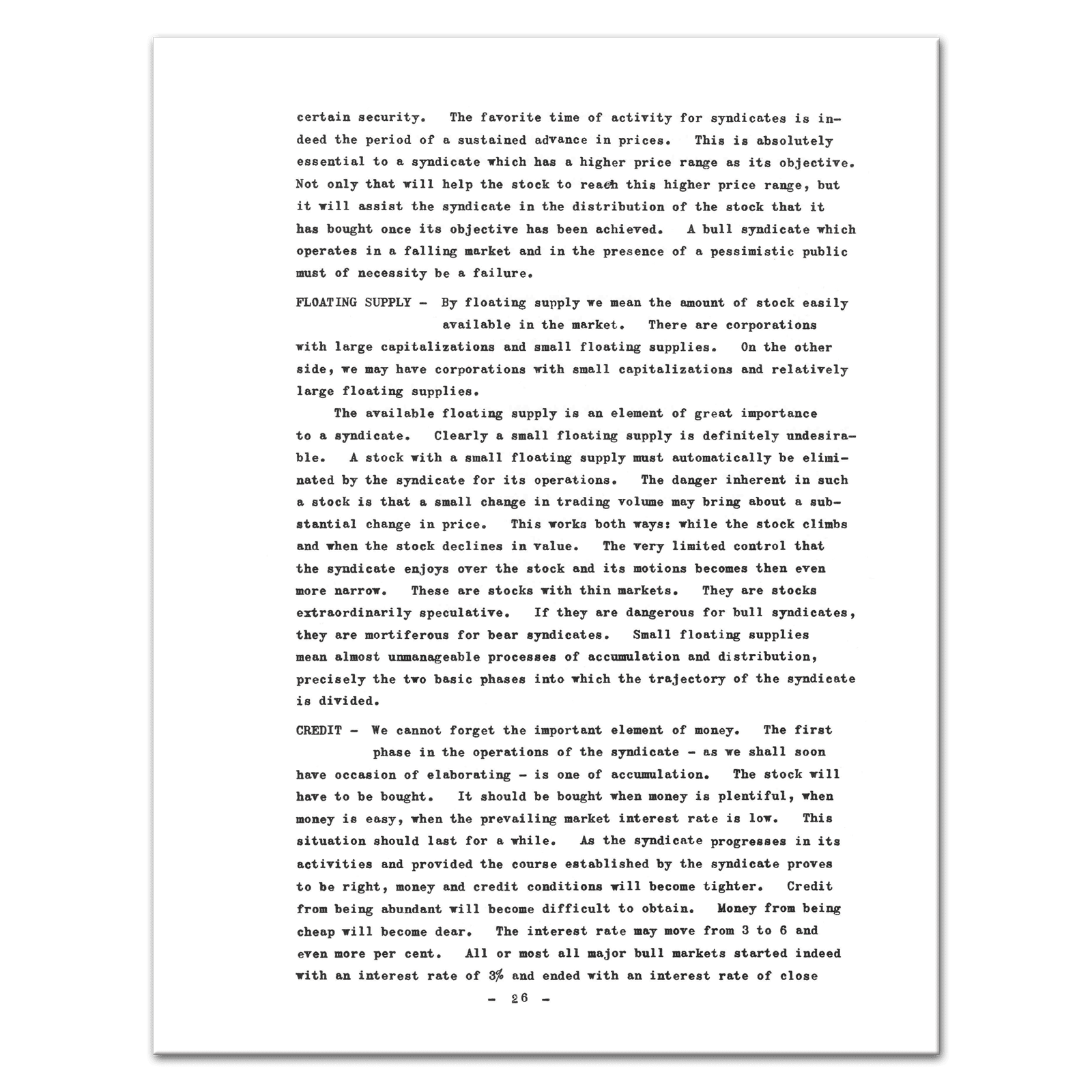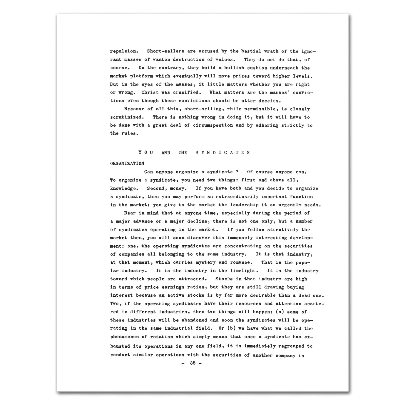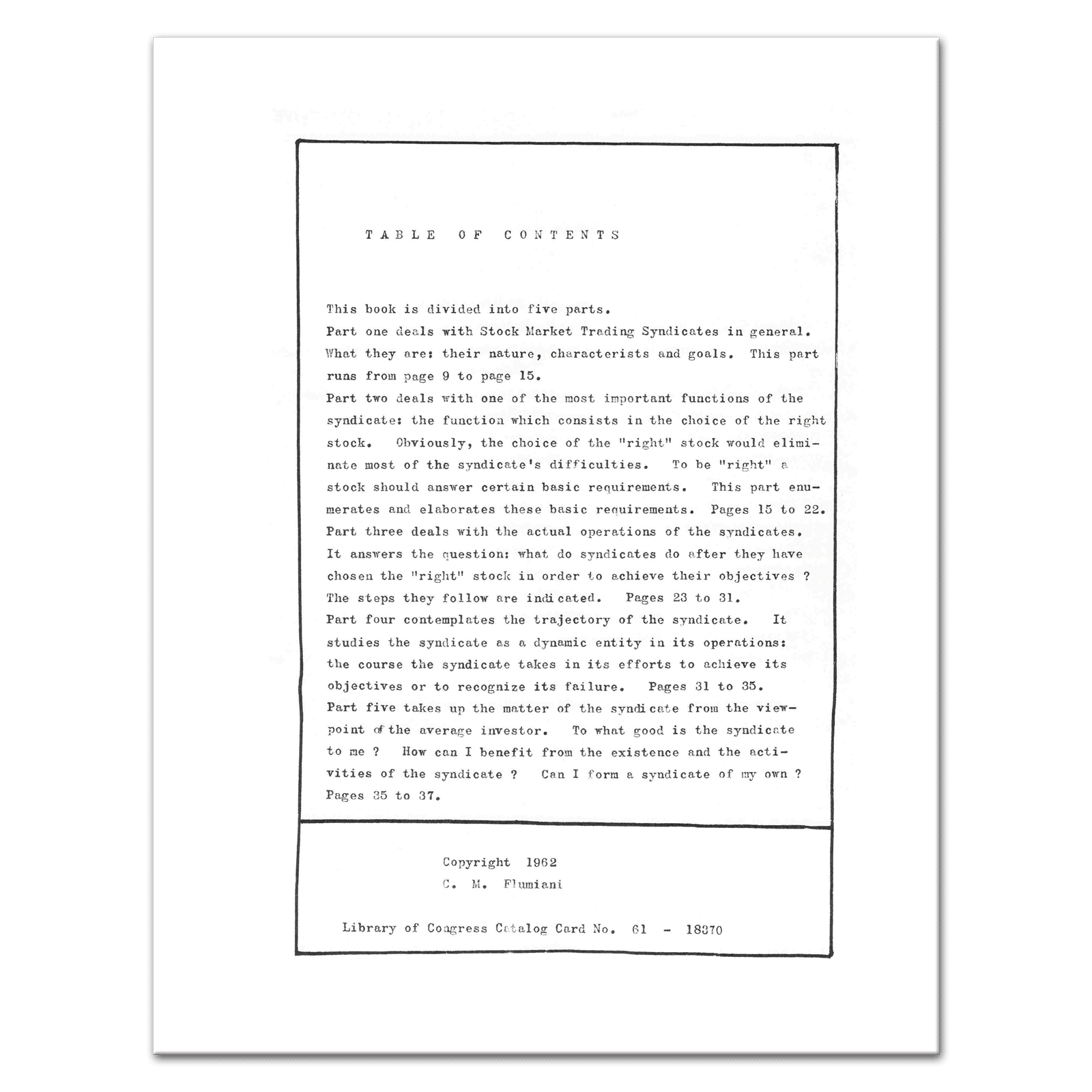 Contents: This book in divided up into five parts. Part one deals with Stock Market Trading Syndicates in general. What they are: their nature, characteristics and goals. This part runs from page 9 to page 15. Part two deals with one of the most important functions of the syndicate: the function which consists in the choice of the right stock. Obviously, the choice of the “right” stock would eliminate most of the syndicate’s difficulties. To be “right” a stock should answer certain basic requirements. This part enumerates and elaborates these basic requirements. Pages 15 to 22. Part three deals with the actual operations of the syndicates. It answers the question: what do syndicates do after they have chosen the “right” stock in order to achieve their objectives? The steps they follow are indicated. Pages 23 to 31. Part four contemplates the trajectory of the syndicate. It studies the syndicate as a dynamic entity in its operations: the course the syndicate takes in its efforts to achieve its objectives or to recognize its failure. Pages 31 to 35. Part five takes up the matter of the syndicate from the view-point of the average investor. To what good is the syndicate to me? How can I benefit from the existence and the activities of the syndicate? Can I form a syndicate of my own. Pages 35 to 37. — Includes two hand-scribbled illustrations, Extremely Scarce, 37 Pages, Collectible.