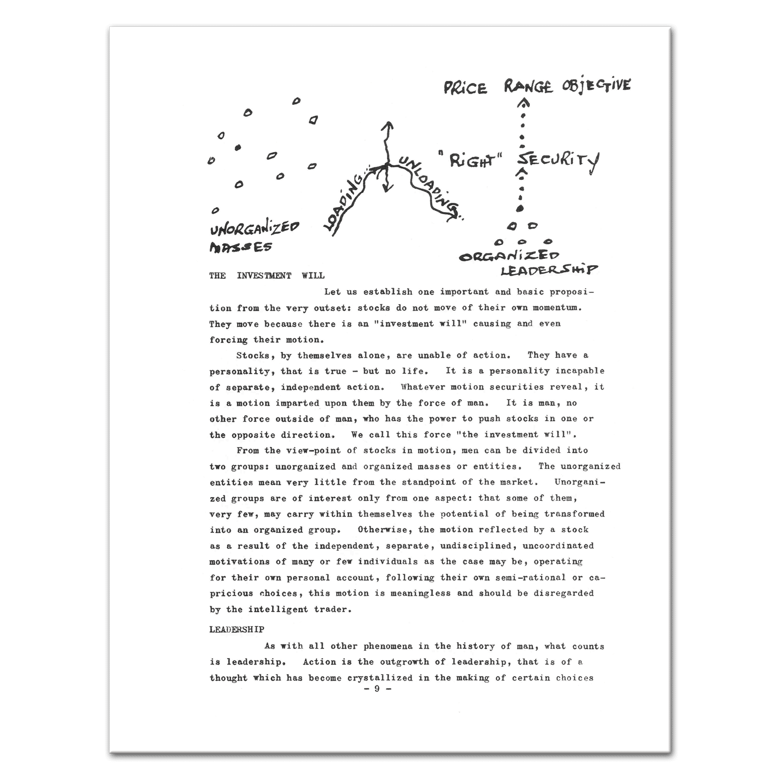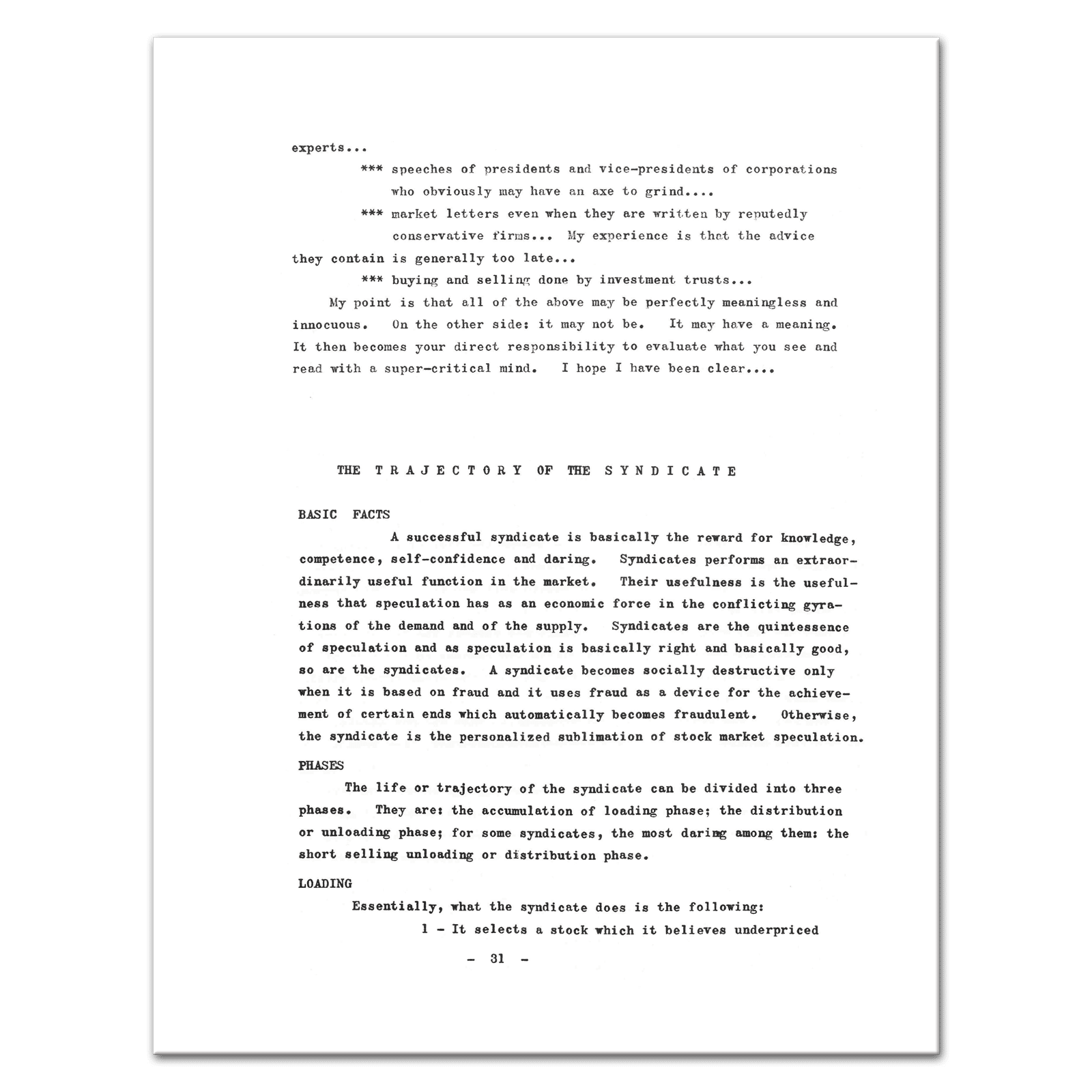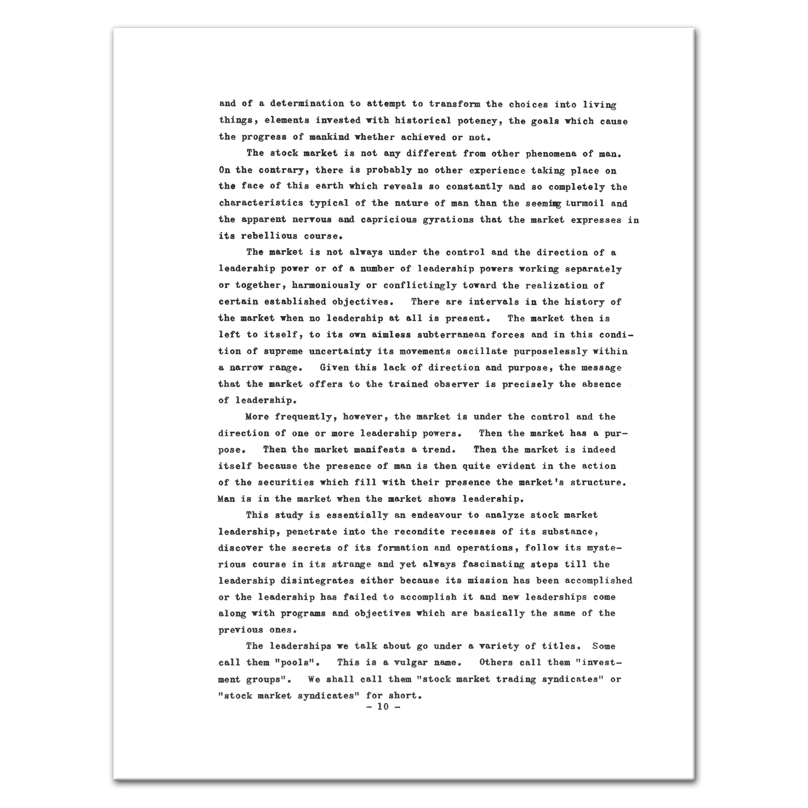 Contents: This book in divided up into five parts. Part one deals with Stock Market Trading Syndicates in general. What they are: their nature, characteristics and goals. This part runs from page 9 to page 15. Part two deals with one of the most important functions of the syndicate: the function which consists in the choice of the right stock. Obviously, the choice of the “right” stock would eliminate most of the syndicate’s difficulties. To be “right” a stock should answer certain basic requirements. This part enumerates and elaborates these basic requirements. Pages 15 to 22. Part three deals with the actual operations of the syndicates. It answers the question: what do syndicates do after they have chosen the “right” stock in order to achieve their objectives? The steps they follow are indicated. Pages 23 to 31. Part four contemplates the trajectory of the syndicate. It studies the syndicate as a dynamic entity in its operations: the course the syndicate takes in its efforts to achieve its objectives or to recognize its failure. Pages 31 to 35. Part five takes up the matter of the syndicate from the view-point of the average investor. To what good is the syndicate to me? How can I benefit from the existence and the activities of the syndicate? Can I form a syndicate of my own. Pages 35 to 37. — Includes two hand-scribbled illustrations, Extremely Scarce, 37 Pages, Collectible.